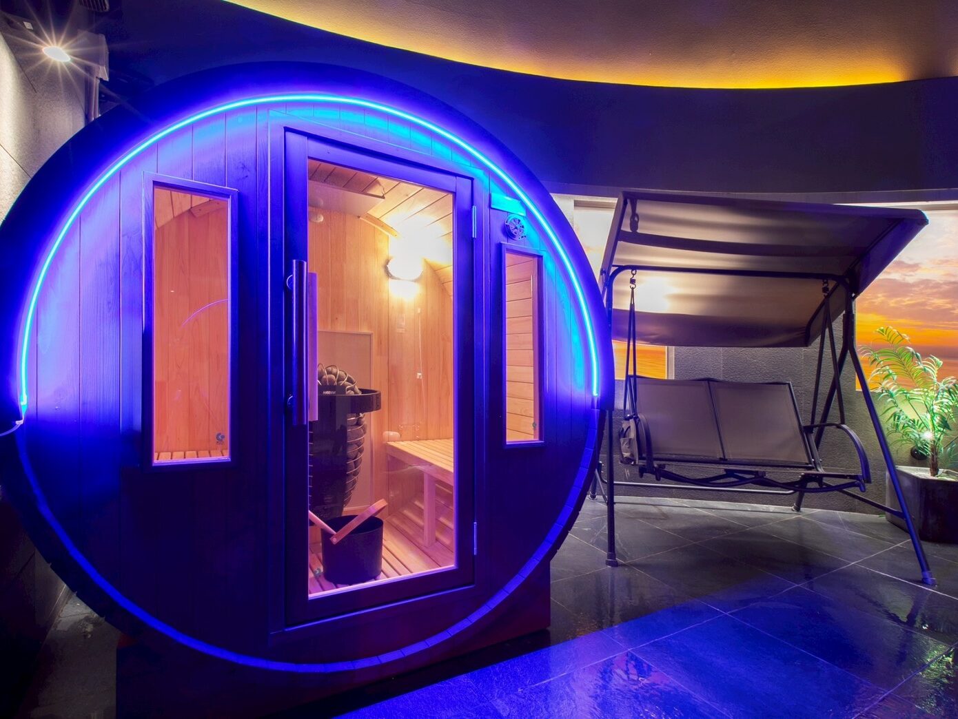 サウナ後の火照った体を、ブランコの心地よい揺れとともに冷ます。