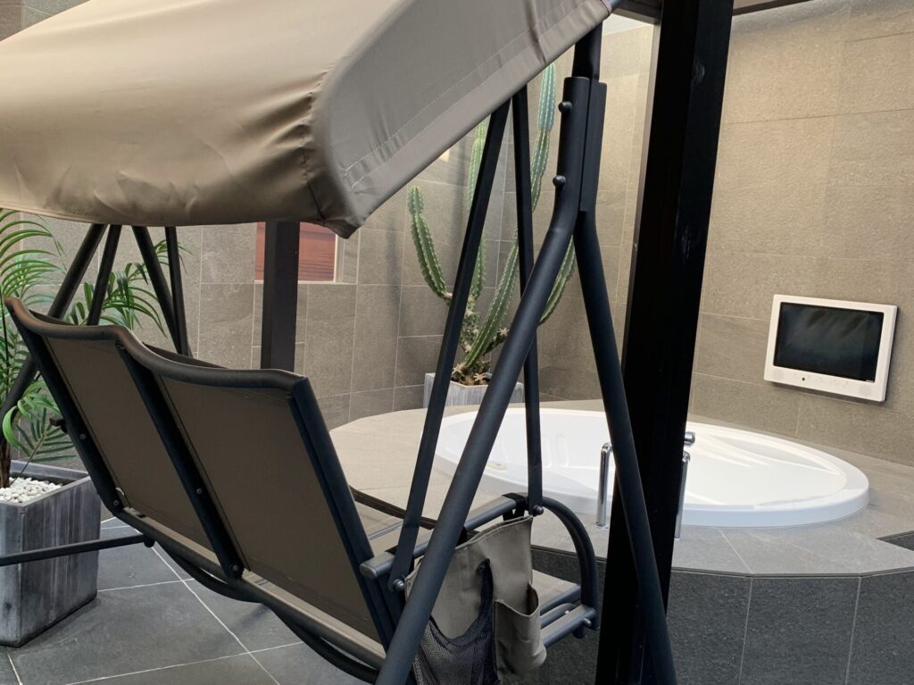 今回のプロジェクトでは、このブランコをサウナのすぐ隣に配置し、外気浴の主役として再定義しました。
